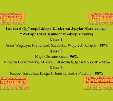 W edycji zimowej Ogólnopolskiego Konkursu Języka Niemieckiego "Weltsprachen Kinder" laureatami zostali następujący uczniowie: Klasa 4: