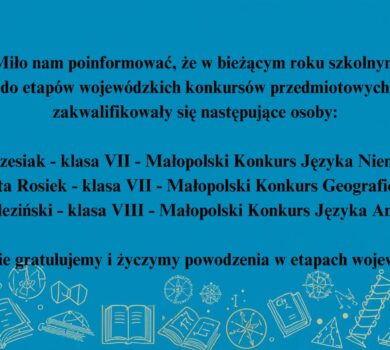 W bieżącym roku szkolnym do etapów wojewódzkich konkursów przedmiotowych organizowanych pod patronatem Małopolskiego Kuratorium Oświaty w Krakowie zakwalifikowali