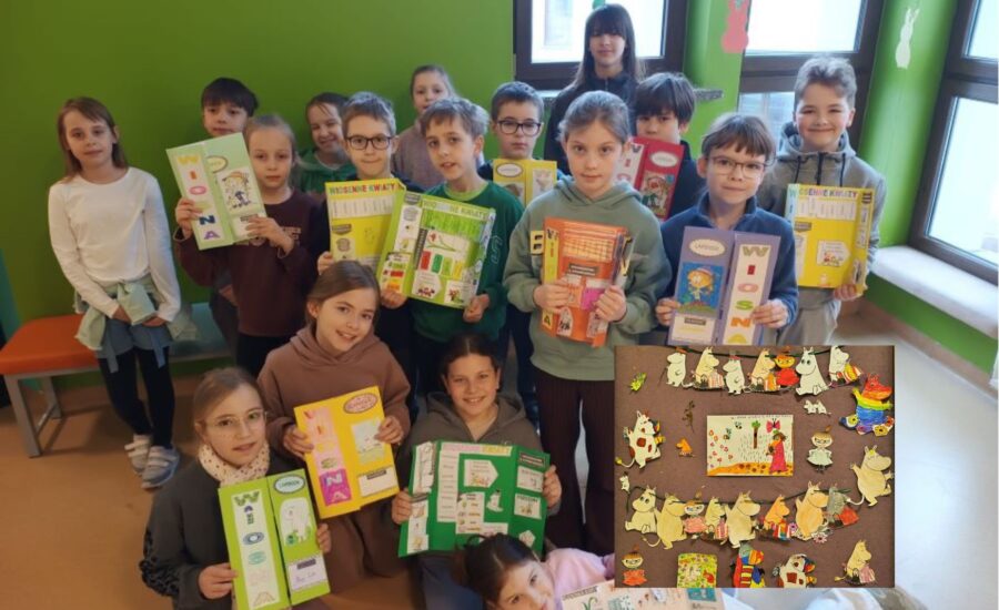 Już po raz trzeci w tym roku szkolnym uczniowie klas 0 -3 poznawali przygody Muminków. Tym razem wspólnie z bohaterami książek Tove Janson poszukiwali wiosny. Były wiosenne lapbooki, tworzenie medalionów z suszonych kwiatów,