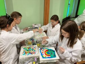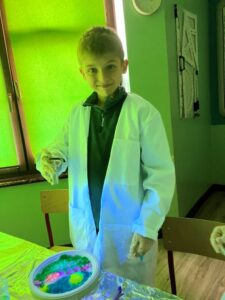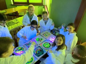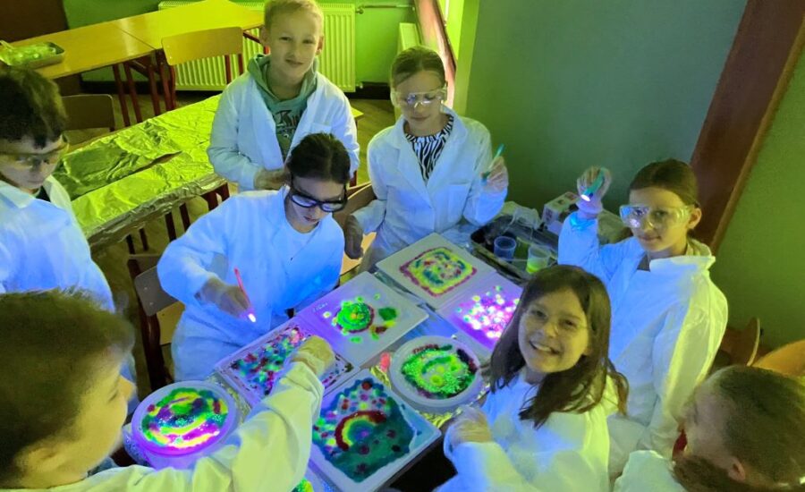 Koło chemiczne i Koło Młodych Odkrywców cieszą się bardzo dużą popularnością wśród uczniów klas piątych. Nic dziwnego. Prowadząca je nauczycielka – p. mgr Izabela Madej – zawsze wymyśli jakieś ciekawe eksperymenty. Tym razem uczniowie tworzyli obrazki fluorescencyjne i poznawali właściwości i zastosowanie poliakrylanu sodu. To była prawdziwa nauka prezentowana przez doświadczenia.