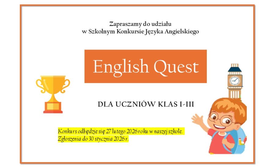 Serdecznie zapraszamy uczniów klas I-III do udziału w Szkolnym Konkursie Języka Angielskiego „English Quest”. Konkurs odbędzie się w dniu 27 lutego 2026r. Zgłoszenia należy kierować do p. mgr Anny Hapek-Dalton do dnia 30 stycznia 2026 roku. Na zwycięzców czekają dyplomy i nagrody.