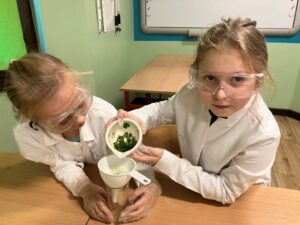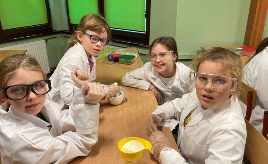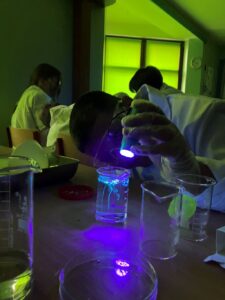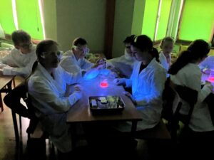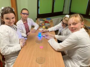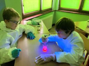 Uczniowie na kole chemicznym oraz w Klubie Młodego Odkrywcy zgłębiali tajniki luminescencji. Sprawdzali na jaki kolor pod wpływem lampki UV świeci eskulina z kory kasztanowca, chlorofil z liści sałaty, porfiryny z skorupek jajek oraz chinina w toniku. Młodzi chemicy dowiedzieli się, jak sprawdzić, czy naszyjnik z bursztynów jest prawdziwy oraz czy kupiony krem z filtrem UV stanowi odpowiednią ochronę dla skóry. Na koniec zajęć uczniowie wcielili się w detektywów i wykrywali prawdziwą krew. Przygoda ze świeceniem dostarczyła dużo emocji.